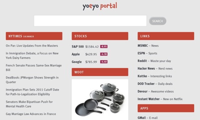 A PHP powered start page for your web browser that displays RSS feeds for the NY Times, Woot, Weather, and Stock Quotes. It also displays a set of static links you can customize in the config file. The design is fluid and responsive, so it will scale down for phones and tablets.